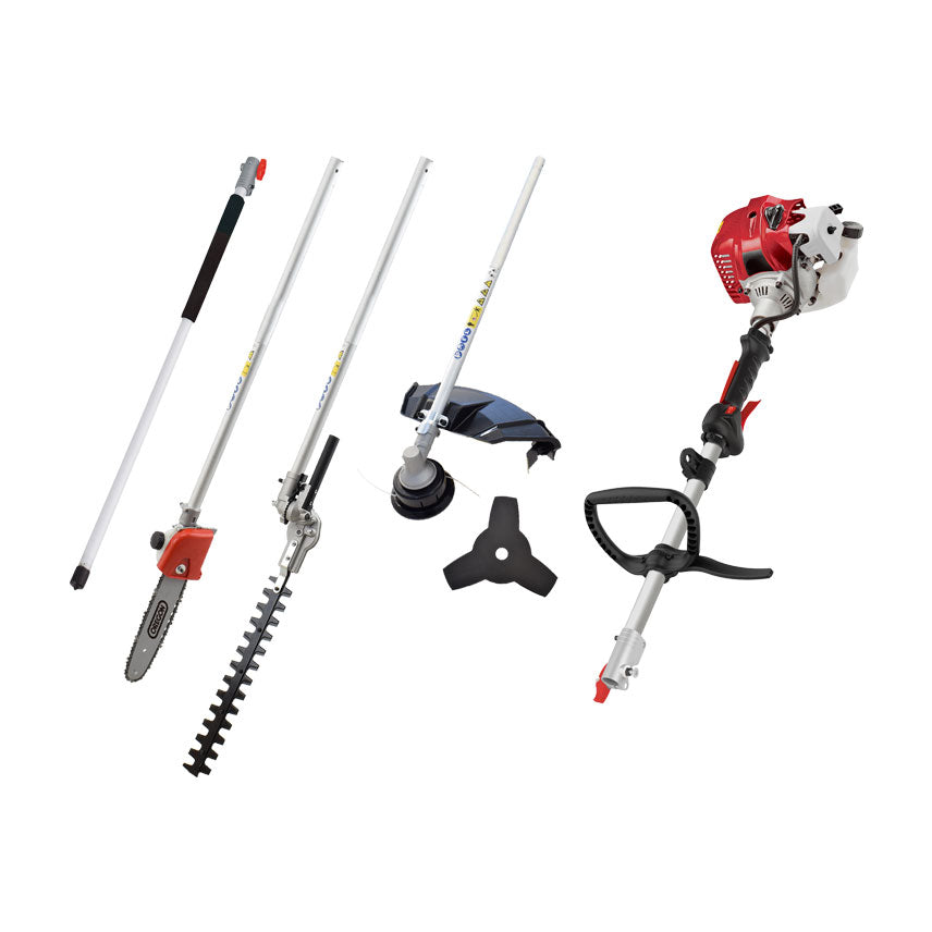 Multitool Attila ADG 34-C. Larghezza di taglio decespugliatore: 430 mm. Larghezza di taglio del disco: 255 mm. Lunghezza di taglio applicazione tagliasiepi: 400 mm. Lunghezza di taglio applicazione potatore: 254 mm (10"). Potatore con barra e catena Oregon.